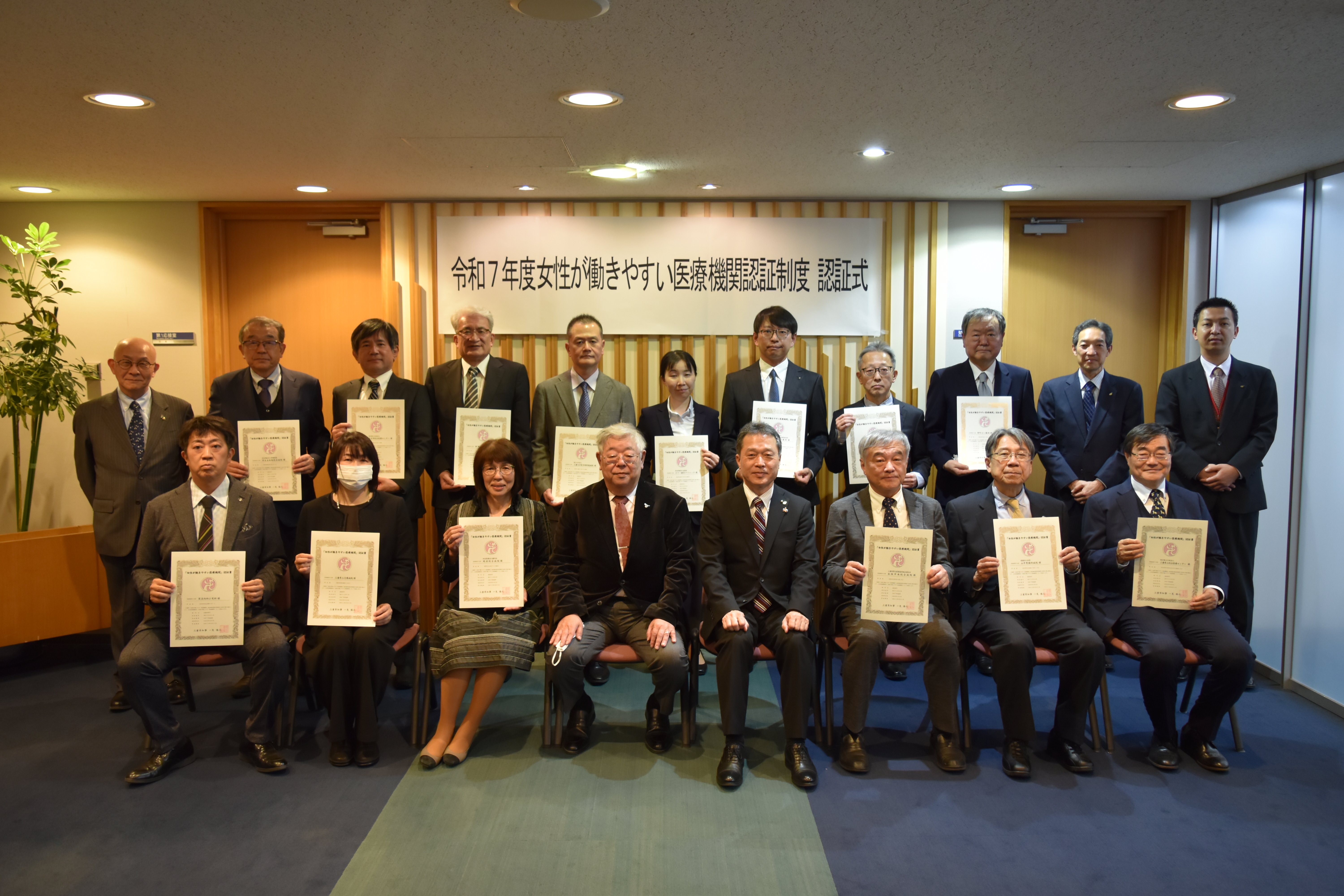 令和8年3月2日、令和7年度「女性が働きやすい医療機関」認証制度認証式にて 上段左端から3番目が当院の宮副院長