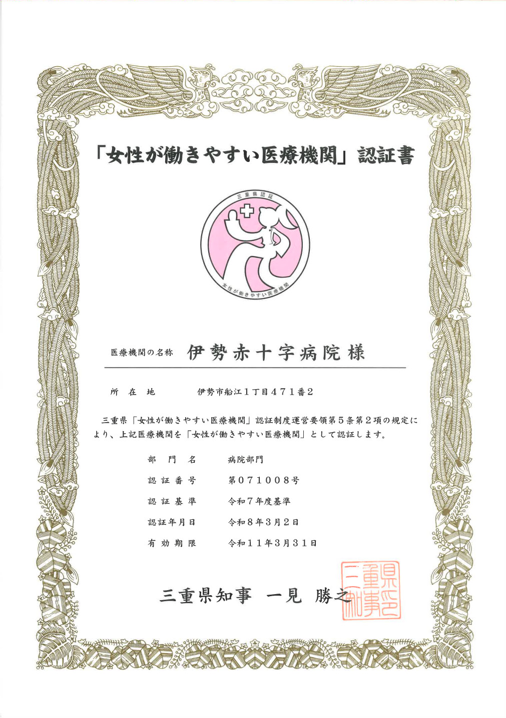 「女性が働きやすい医療機関認証制度」とは、平成27年度に三重県が全国に先駆けて創設した制度で、医療スタッフ確保のため、妊娠時・子育て時の当直免除、短時間勤務等の制度の整備や、保育施設の整備、また、それを利用できる職場の雰囲気づくりなどに積極的に取り組む医療機関を評価し、該当機関が社会的に評価される仕組みを作ることにより、女性が働きやすい環境づくりの促進を図ることを目的としています。令和7年度は、当院を含め14施設が認証を受けました。